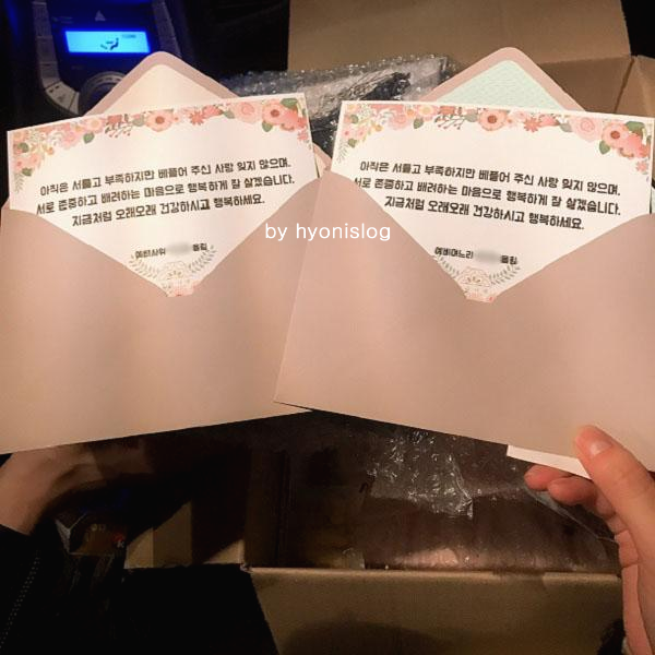 무엇보다 안에 메시지 카드도 선택할 수 있어서 상견례 선물로 딱이더라고요. 예비신랑 ㅇㅇㅇ, 예비신부 ㅇㅇㅇ 이렇게 이름까지 프린트가 되더라고요.